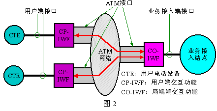 下圖2是VoATM的參考模型。其中的CTE為用戶電話終端設備,“業(yè)務接入結(jié)點”是指用戶電話業(yè)務的提供網(wǎng)絡在ATM網(wǎng)絡側(cè)的界;其中的CP-IWF完成用戶電路和ATM網(wǎng)絡的協(xié)作功能,而CO-IWF則完成ATM網(wǎng)絡和業(yè)務網(wǎng)絡的協(xié)作功能。