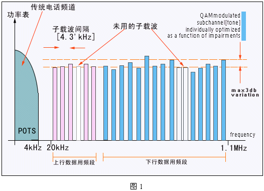 DSL技術是在人們對高速互聯(lián)網(wǎng)訪問需求推動下的產(chǎn)物。DSL利用頻率復用和OFDM調(diào)制技術,在不影響傳統(tǒng)電話業(yè)務的前提下可以為用戶提供最高達8Mbps的數(shù)據(jù)傳輸速率。這個速率是基于POTS的Modem速率(以目前的最高速率56kbps為參考)的140倍;DSL技術所帶來的巨大帶寬為家庭和小型公司提供了一個寬帶數(shù)字業(yè)務的新平臺。這個DSL平臺可以支持多種寬帶業(yè)務:包括高速Internet接入、虛擬專網(wǎng)及VOD等流媒體業(yè)務。其基本原理如下圖1所示: