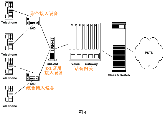 圖4給出了BLES的邏輯結(jié)構(gòu)。這種方式下,VoDSL廠商必須設(shè)計開發(fā)用于和已有的用戶設(shè)備、DSL網(wǎng)絡(luò)及Class 5交換機互通的接口設(shè)備;用戶側(cè)設(shè)備IAD為數(shù)據(jù)傳輸提供了Ethernet和ATM接口,為話音傳送提供了一定數(shù)量的模擬用戶線接口,每一接口都被分配了唯一的DSL電路。話音網(wǎng)關(guān)和Class 5交換機間的接口協(xié)議,在美國等地區(qū)采用GR-303和TR-08標準,而在歐洲標準中使用V5.2接口。參見后面的圖6。