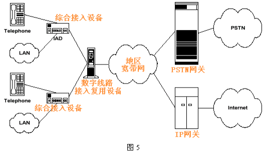 這種方式又稱為VoMBN/VoMSBN(Voice over Multi-service Broadband Network)。圖5給出了MSDN的邏輯結(jié)構(gòu)這種方式下,DSL本地環(huán)路和PSTN及Internet間的互聯(lián)不再通過Class 5交換機,而由地區(qū)寬帶多業(yè)務(wù)網(wǎng)絡(luò)代替,從用戶側(cè)看仍和Class 5 交換機等效,當其功能復雜得多。這個網(wǎng)絡(luò)可以是基于IP或ATM的,它包含信令系統(tǒng)和呼叫處理服務(wù)器及各種網(wǎng)關(guān)設(shè)備。