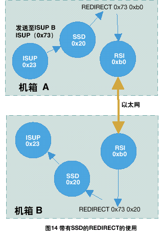 例如,一個(gè)雙ISUP系統(tǒng)應(yīng)該由兩個(gè)ISUP部分組成,每部分缺省module_id都為0x23。A方ISUP的配置數(shù)據(jù)表示另一個(gè)ISUP部分的module_id為0x73;因此,在A方將會(huì)有一個(gè)重定向的動(dòng)作來對(duì)經(jīng)過RSI發(fā)送往0x73的任何訊息重新定向。在B方,應(yīng)該有一個(gè)REDIRECT語句將B方RSI所接收的所有目標(biāo)為0x73的訊息路由到本地ISUP,標(biāo)識(shí)為0x23。具體情況如圖13所示。