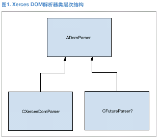 Xerces DOM解析器對象的類層次結(jié)構(gòu)非常類似于其它CSF電話網(wǎng)絡(luò)、數(shù)據(jù)通信或語音設(shè)備。抽象的DOM解析器設(shè)備包括實(shí)施任何類似解析器的有用狀態(tài)信息和基本數(shù)據(jù)及方法。具體的XercesDOMParser類出自于抽象類,并提供了針對特定Xerces解析器的具體方法和數(shù)據(jù)。其它類似的DOM解析器如果添加到CSF,也可以基于同樣的抽象類進(jìn)行構(gòu)建。圖1詳細(xì)描述了該類層次結(jié)構(gòu)。