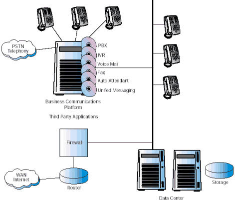 圖1描述了當前一個典型的復雜的企業(yè)通信系統(tǒng)配置。連接到PSTN的主要部分PBX/KTS,仍然是系統(tǒng)的核心,提供了交換和自動呼叫分配的功能。一系列增加的應用通過附屬服務器連接到PBX/KTS上。很多附屬服務器也連到數(shù)據(jù)中心上,因為它們需要訪問企業(yè)的數(shù)據(jù)。 使現(xiàn)有情況變得更為復雜的是,Internet正在變?yōu)椴豢扇鄙俚纳虅展ぞ撸鞴炯娂姲惭bVoIP以降低網(wǎng)絡成本,滿足多媒體通信的需要。這些服務由企業(yè)防火墻后的網(wǎng)關提供,這個網(wǎng)關也是連接到PBX/KTS上的。