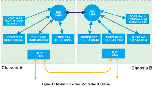 下圖中描述了一個雙ISUP/TUP/SCCP/TCAP系統(tǒng)中各模塊之間的關(guān)系,以及系統(tǒng)兩部分的config.txt文件中的條目。參見圖15。