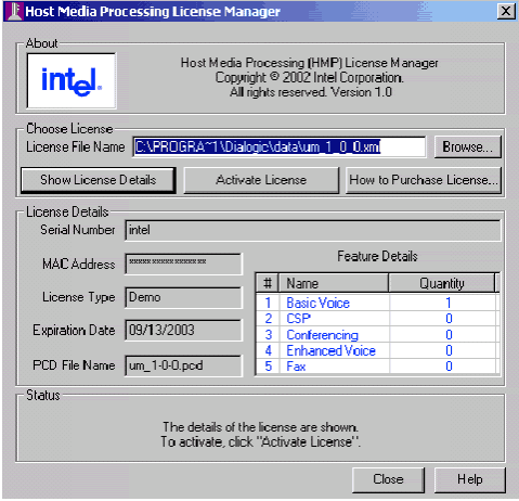 2. 如果HMP許可證管理器GUI沒有出現在屏幕上,可通過開始 > 程序> Dialogic HMP 1.0